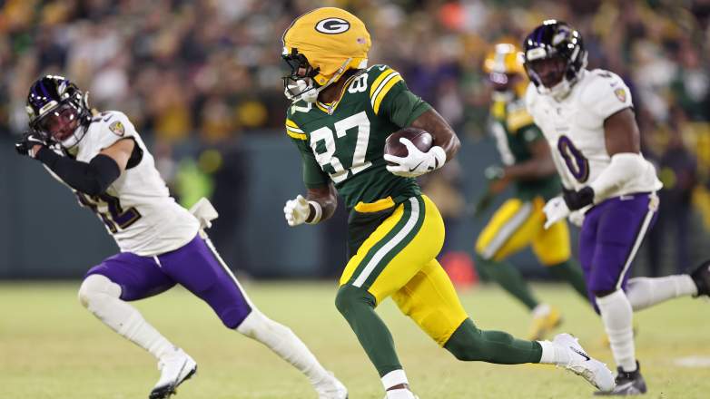 Getty GREEN BAY, WISCONSIN – 27 DE DICIEMBRE: Romeo Doubs #87 de los Green Bay Packers corre con el balón en el segundo cuarto contra los Baltimore Ravens en Lambeau Field el 27 de diciembre de 2025 en Green Bay, Wisconsin. (Foto de Michael Reaves/Getty Images)