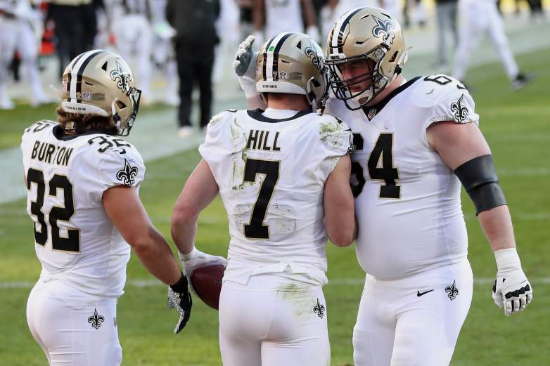 Getty Taysom Hill #7 de los New Orleans Saints celebra junto a Michael Burton #32 y Will Clapp #64 después de correr para un touchdown de dos yardas durante el segundo cuarto de un juego contra los Denver Broncos en Empower Field At Mile High el 29 de noviembre de 2020 en Denver, Colorado.