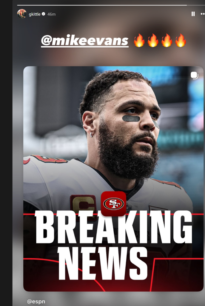 George Kittle republicó la noticia de Mike Evans en Instagram y etiquetó a Evans con emojis de fuego, según la captura de pantalla compartida arriba.