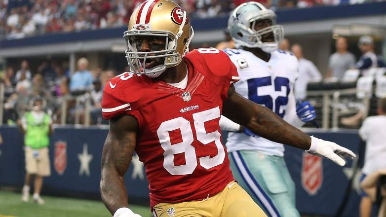 ARLINGTON, TX – 7 DE SEPTIEMBRE: Vernon Davis #85 de los San Francisco 49ers reacciona después de anotar un touchdown mientras Justin Durant #52 de los Dallas Cowboys está cerca en la primera mitad en el AT&T Stadium el 7 de septiembre de 2014 en Arlington, Texas. (Foto de Christian Petersen/Getty Images)