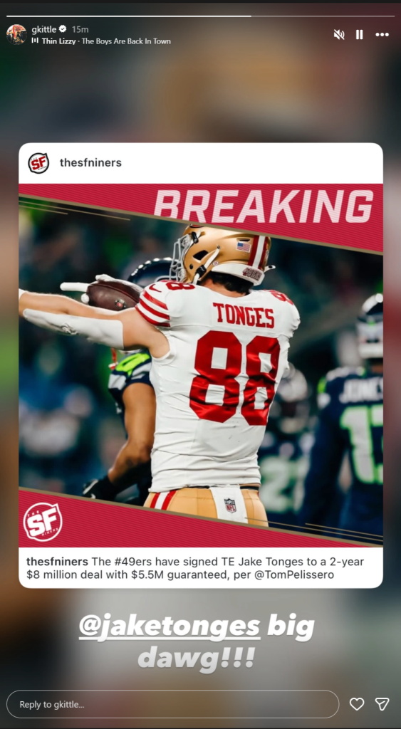 George Kittle no necesitó muchas palabras para dejar en claro sus sentimientos después de que los San Francisco 49ers trajeran de vuelta a Jake Tonges. En una captura de pantalla de Instagram Story compartida el miércoles, Kittle republicó la imagen de la firma de Tonges y escribió: “@jaketonges big dawg!!!” — una reacción rápida pero contundente a una de las últimas decisiones del equipo sobre la agencia libre.