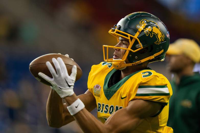 Getty FARGO, DAKOTA DEL NORTE – 19 DE NOVIEMBRE: Bryce Lance #5 de los North Dakota State Bison atrapa un pase antes del partido contra los North Dakota Fighting Hawks en FARGODOME el 19 de noviembre de 2022 en Fargo, Dakota del Norte. (Foto de Sean Arbaut/Getty Images)