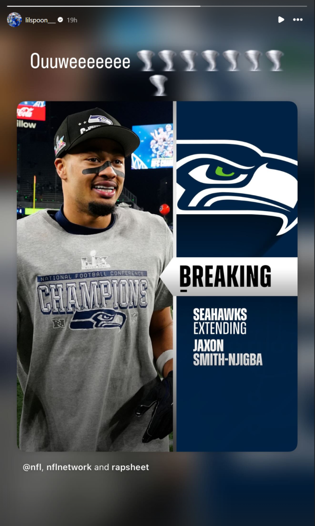 La estrella los Seahawks rápidamente a extensión de contrato de Jaxon Smith-Njigba, publicando una historia en Instagram celebrando la noticia pocos días después de que Seattle también pusiera a Witherspoon en camino a su propio gran contrato. El momento es clave: el nuevo contrato de Smith-Njigba le da a los Seahawks una extensión de , mientras que Witherspoon sigue siendo una de las próximas prioridades obvias de la franquicia en