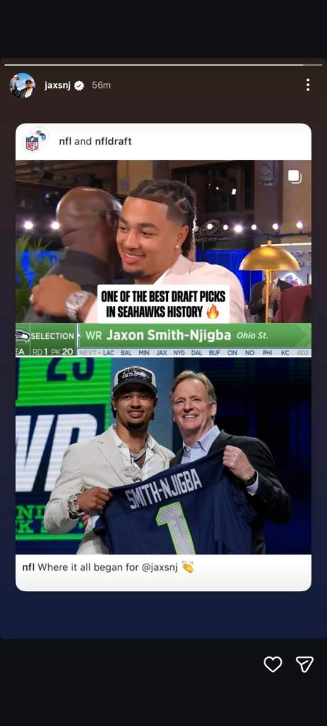 La NFL está haciendo una declaración contundente sobre la conversación acerca de la selección del draft de los Seahawks por parte de Jaxon Smith-Njigba. En una publicación compartida en Instagram y luego republicada en la historia de Smith-Njigba, la cuenta de la NFL/NFL Draft calificó al receptor abierto de Seattle como “una de las mejores selecciones del draft en la historia de los Seahawks”, convirtiendo una discusión de los fanáticos en un tema de conversación principal de la liga.