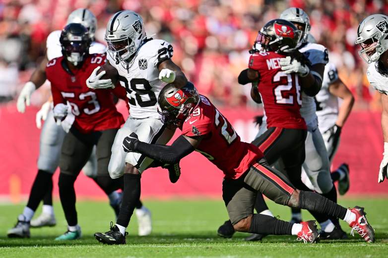 Getty. Sincere McCormick #28 de los Las Vegas Raiders es tackleado por Christian Izien #29 de los Tampa Bay Buccaneers durante el tercer cuarto en el Estadio Raymond James el 8 de diciembre de 2024 en Tampa, Florida.