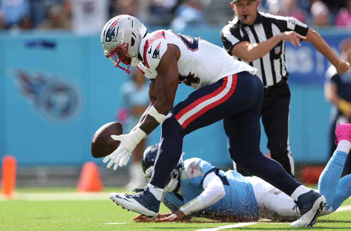 Getty El ala defensiva de los New England Patriots, K’Lavon Chiasson, recupera un balón suelto y anota un touchdown contra los Tennessee Tits durante un partido el 19 de octubre de 2025.