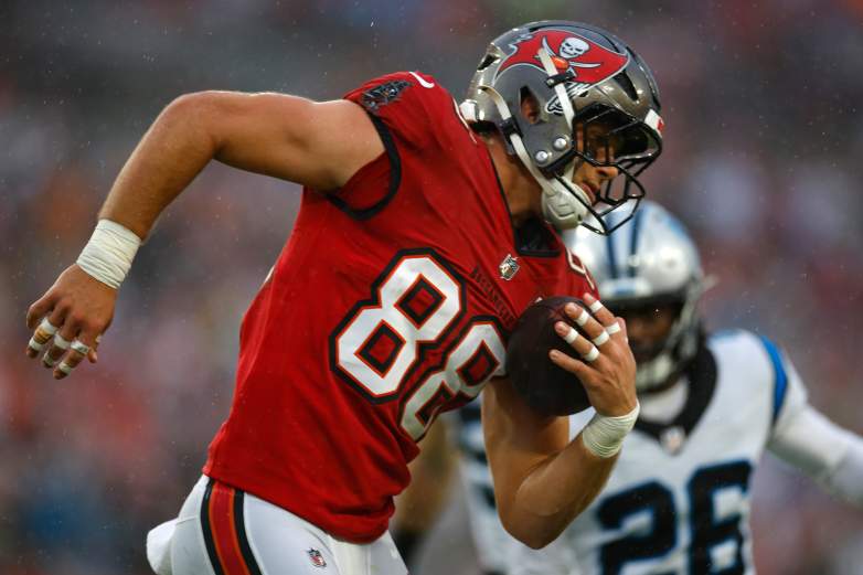 GettyCade Otton #88 de los Tampa Bay Buccaneers corre el balón después de una recepción durante el primer cuarto contra los Carolina Panthers durante un juego en el Raymond James Stadium el 3 de enero de 2026 en Tampa, Florida.