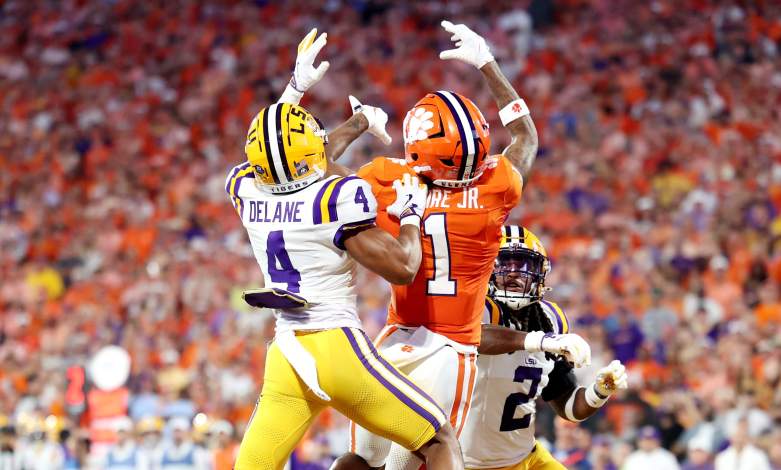 CLEMSON, CAROLINA DEL SUR – 30 DE AGOSTO: TJ Moore #1 de los Tigres de Clemson intenta obtener el balón contra Mansoor Delane #4 y Jardin Gilbert #2 de los LSU Tigers durante el primer cuarto en el Memorial Stadium el 30 de agosto de 2025 en Clemson, Carolina del Sur. (Foto de Katie Januck/Getty Images)