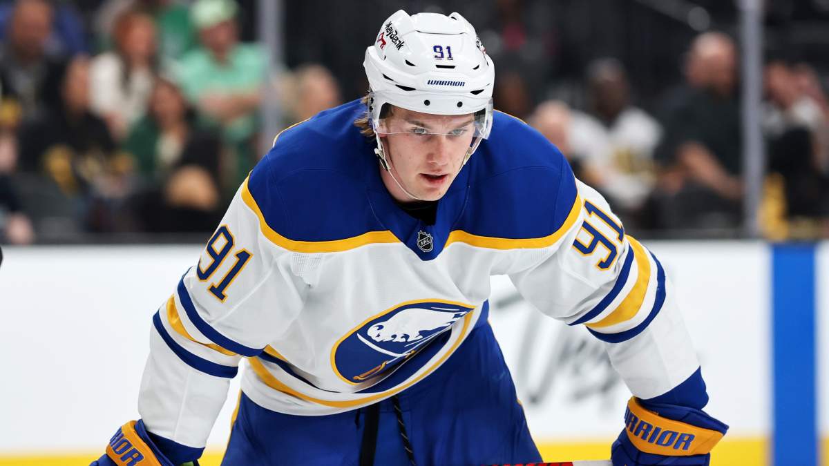 Getty Rasmus Dahlin de Buffalo y Jack Eichel de Vegas atrapados en acción en medio del juego