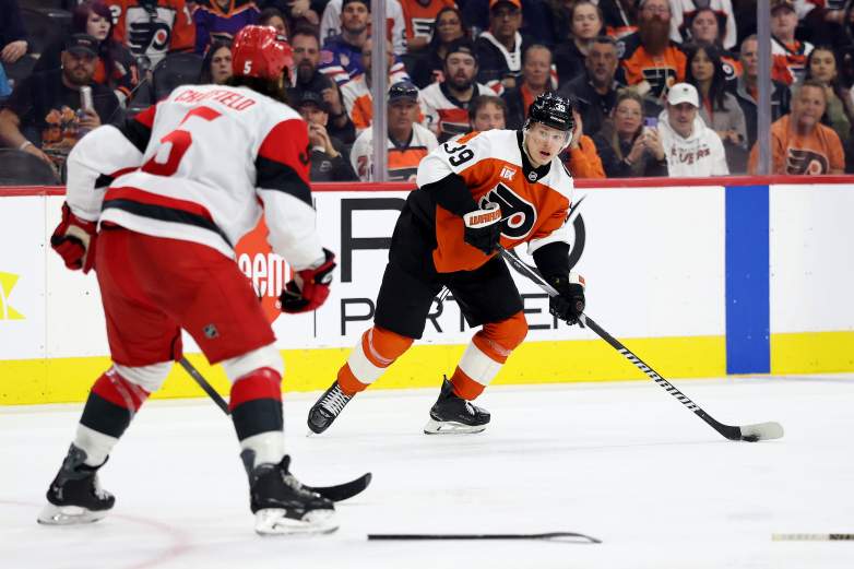 Getty FILADELFIA, PENSILVANIA – 13 DE ABRIL: Matvei Michkov #39 de los Philadelphia Flyers maneja el disco contra Jalen Chatfield #5 de los Carolina Hurricanes durante el segundo período en el Xfinity Mobile Arena el 13 de abril de 2026 en Filadelfia, Pensilvania. (Foto de Emilee Chinn/Getty Images)