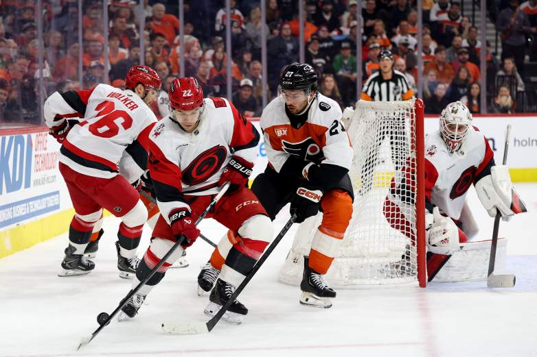 Getty FILADELFIA, PENSILVANIA – 13 DE ABRIL: Logan Stankoven #22 de los Carolina Hurricanes controla el disco contra Noah Cates #27 de los Philadelphia Flyers durante el segundo período en el Xfinity Mobile Arena el 13 de abril de 2026 en Filadelfia, Pensilvania. (Foto de Emilee Chinn/Getty Images)